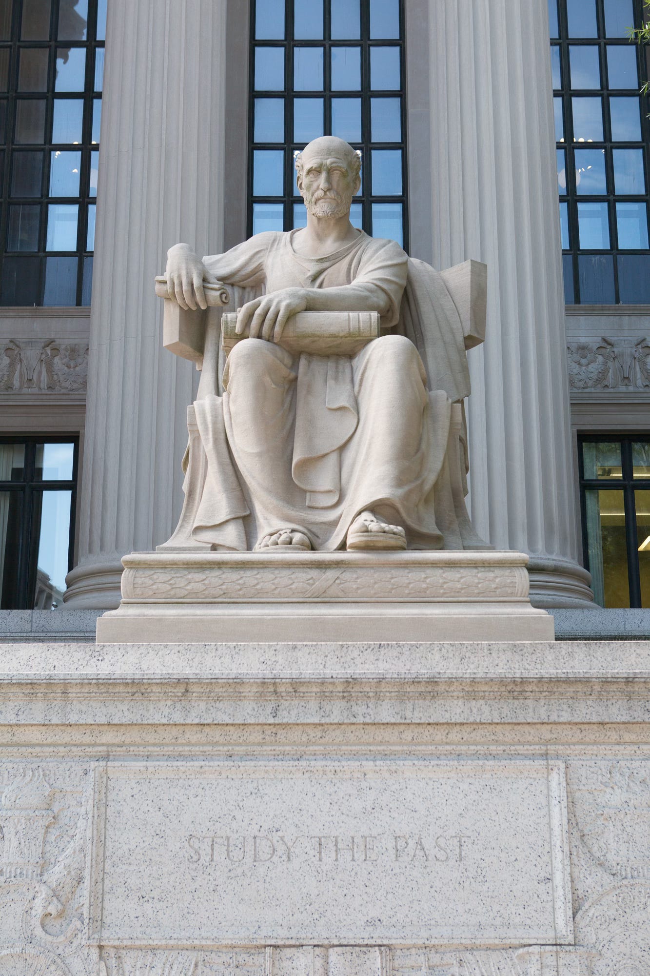 The other sculpture depicts an old man holding a closed book. On the base, these words: “Study the past.” (Paraphrasing Confucius, Study the past if you would divine the future.)