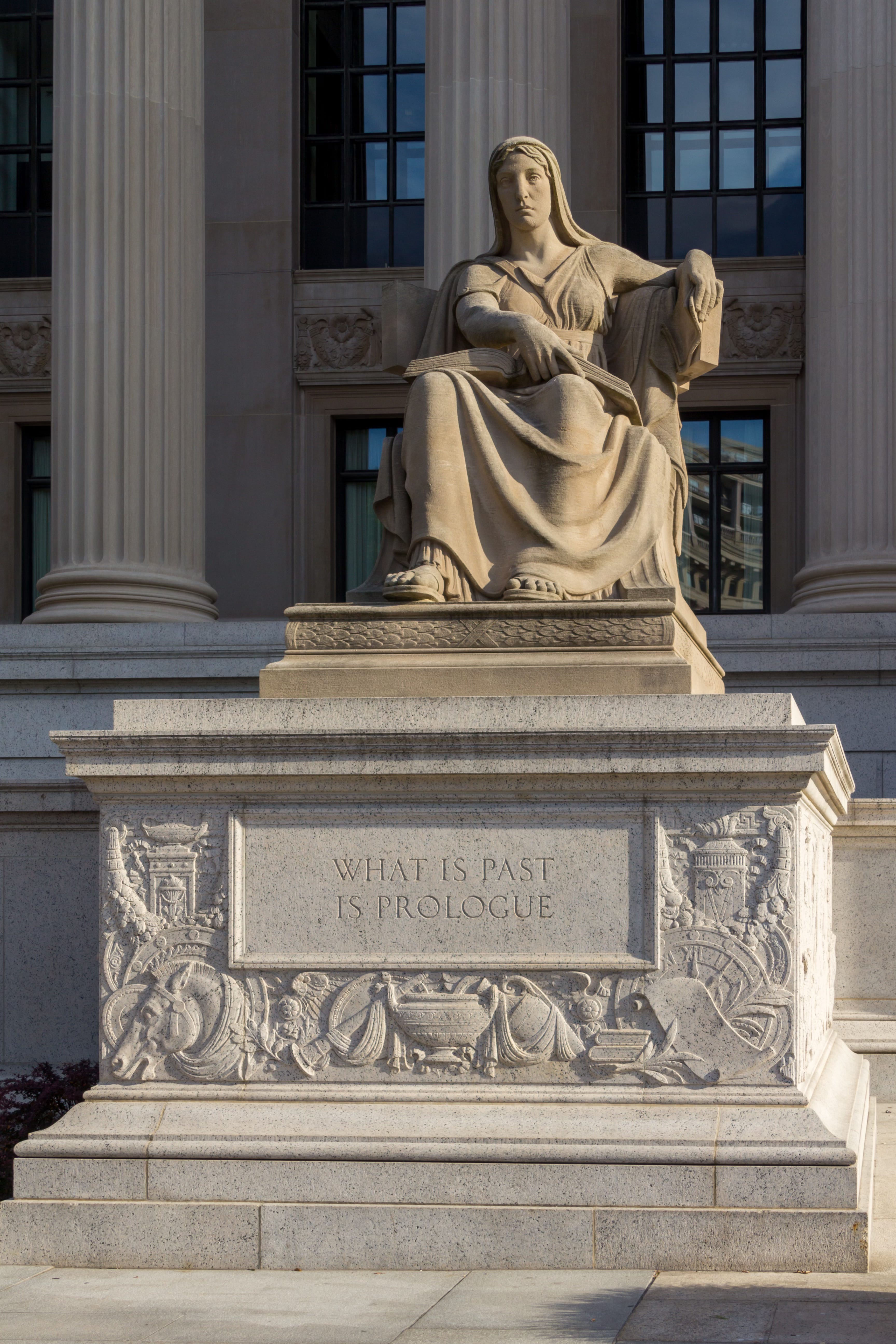 On the base of one of them (depicting a youthful woman holding an open book) is a quote from The Tempest, “What is past is prologue.”