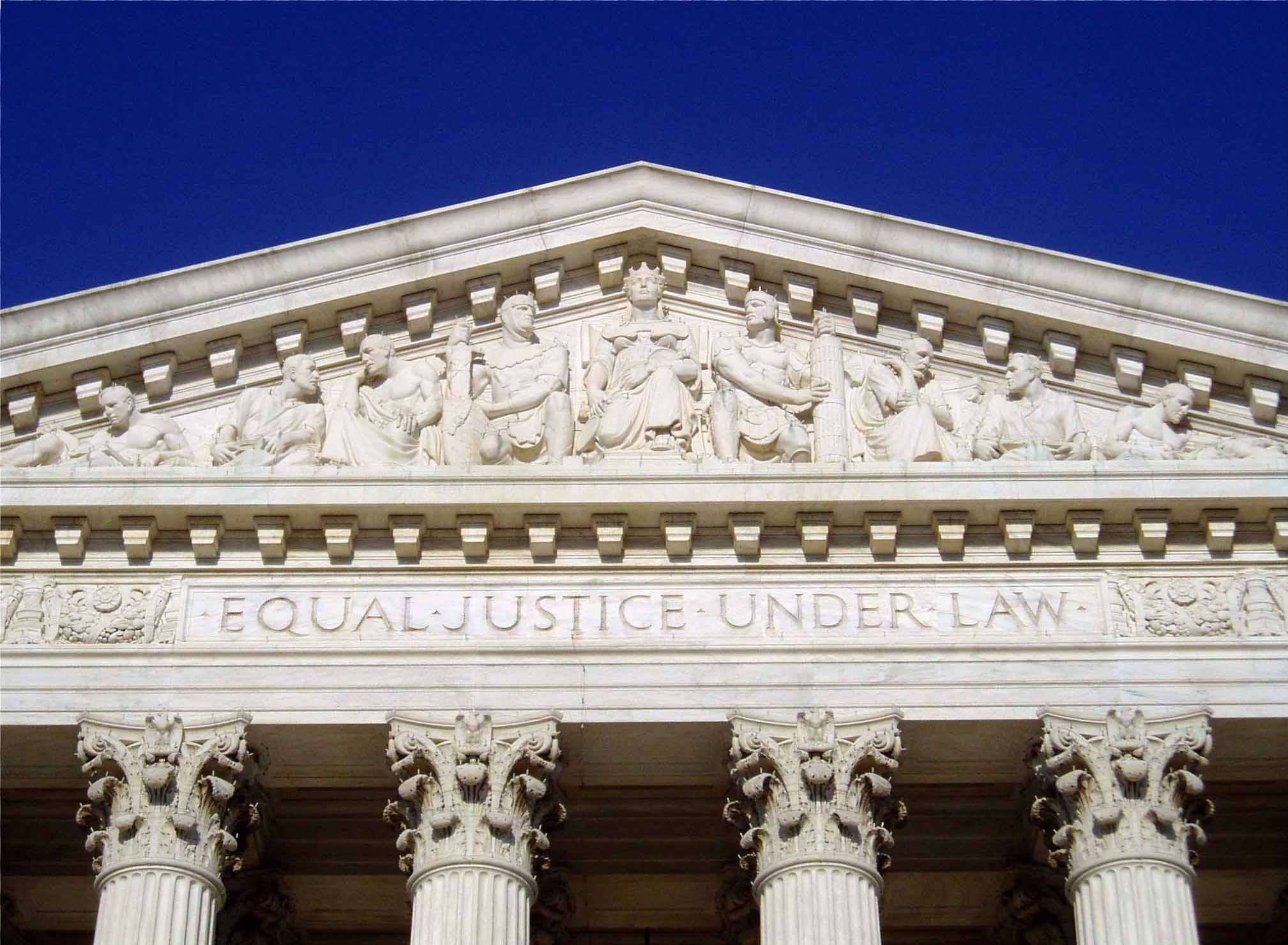 Plus Trump’s personal retribution attacks, facilitated by attorney general Pam Bondi. Bondi’s recent actions threaten the Supreme Court’s purpose. Above the marble columns are the words “Equal justice under law”:
